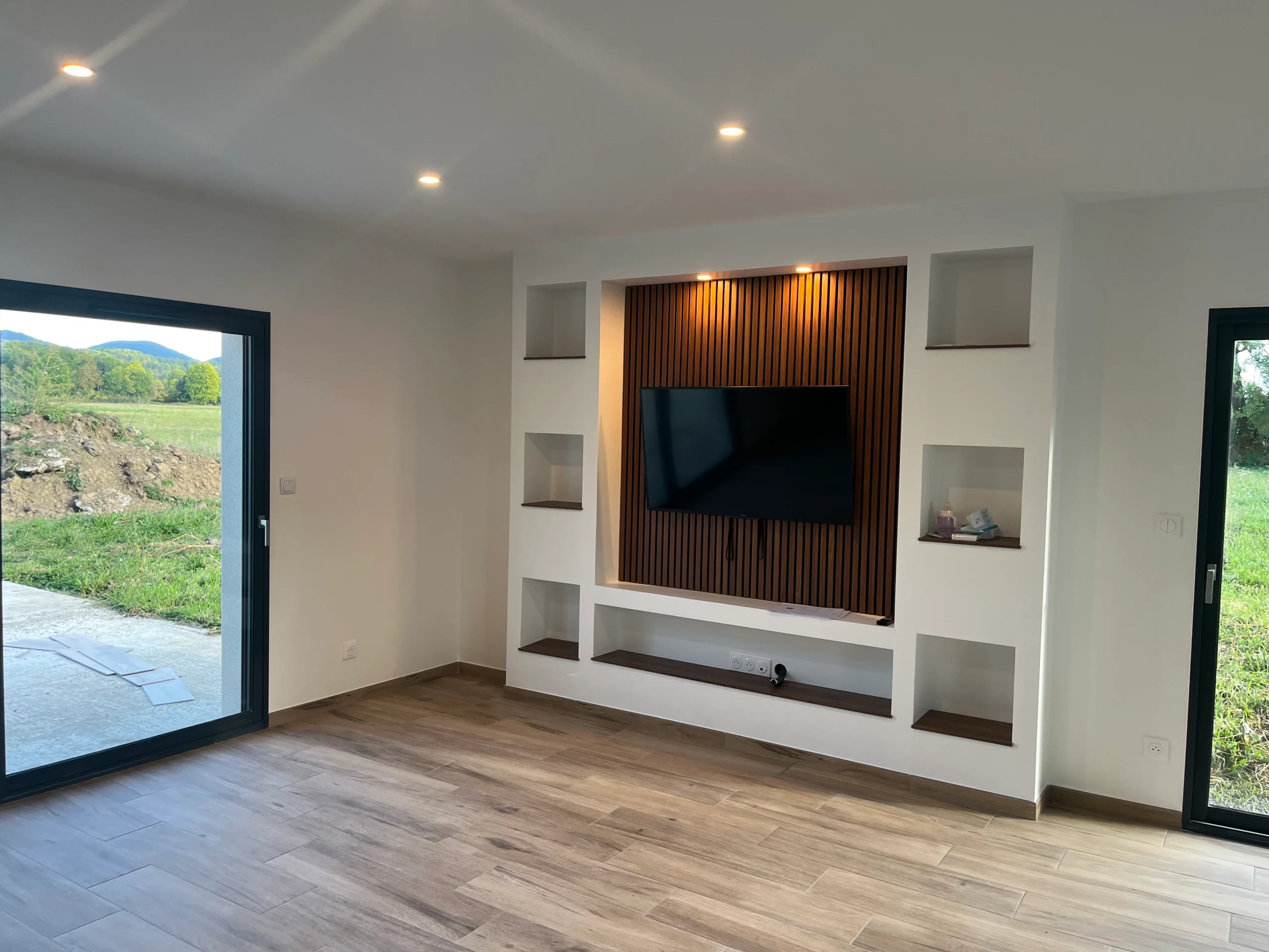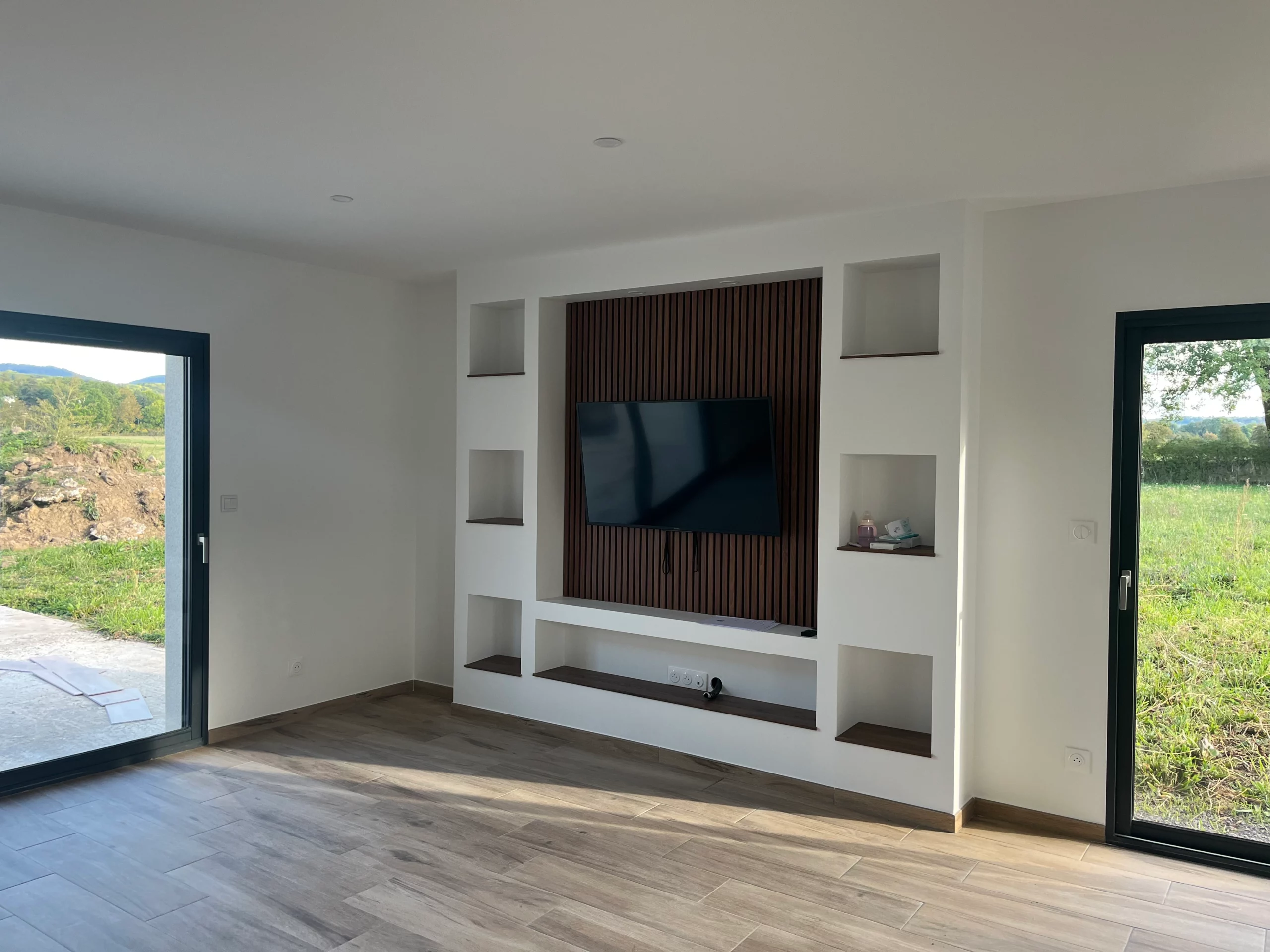 Construction d’une maison en brique, avec 3 chambres, 1 cuisine ouverte donnant sur le salon. L’isolation de la maison est faite avec un nouveau matériaux écologique français et 100 % recyclable qui s’appelle l’Hybris. La maison est chauffée avec un plancher chauffant alimenté par une pompe à chaleur air/eau.